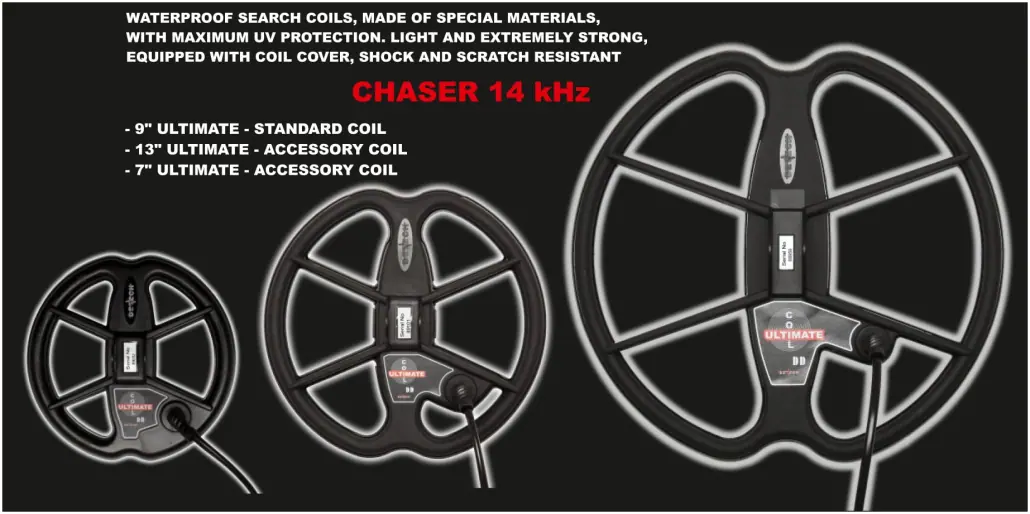 The Chaser 14 features adjustable discrimination, visual and audio battery status indication, and automatic recognition of the connected search coil. It offers two search modes — Normal mode and Deep mode — along with automatic and manual ground balance, allowing adaptation to varying soil conditions.