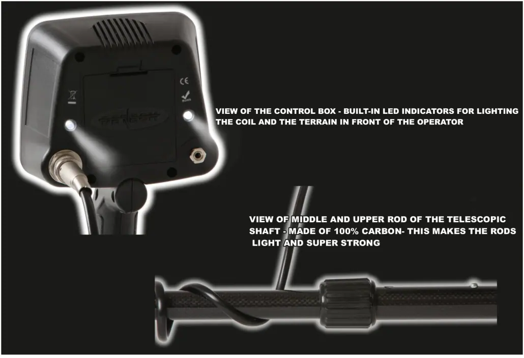 The detector is supplied with a large 14″ DD search coil, optimized for depth and ground coverage. Its digital electronics and microprocessor-controlled system ensure consistent performance and reliable signal processing during deep searches.