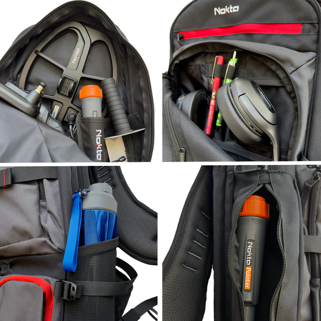 The Nokta DetectoBag is a purpose-built backpack designed for safe transport and organized storage of metal detecting equipment. It provides sufficient internal space for a disassembled metal detector, additional search coils, and essential accessories.