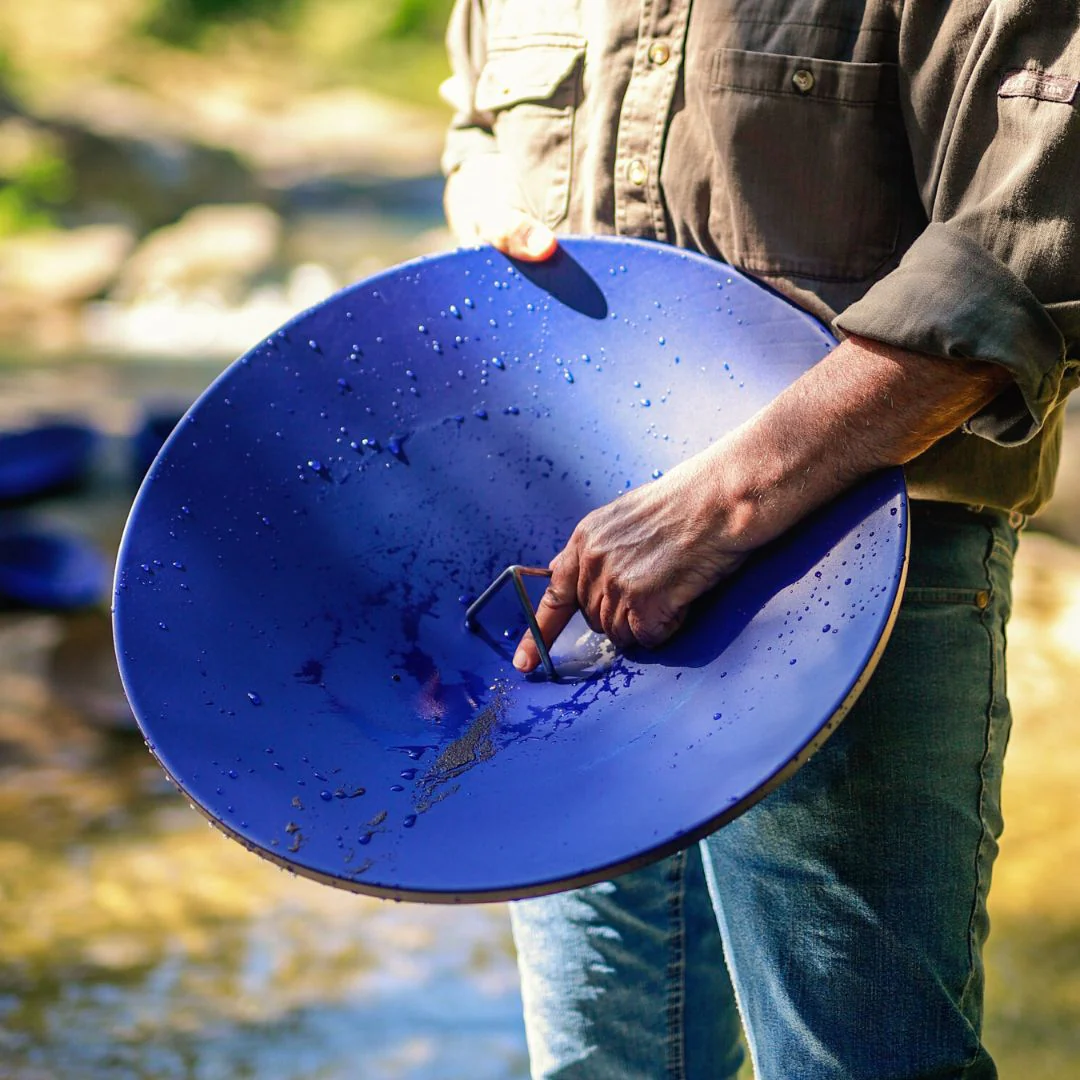 The included classifier allows removal of coarse material before panning. The pan’s color improves visual contrast, assisting identification of gold during processing.